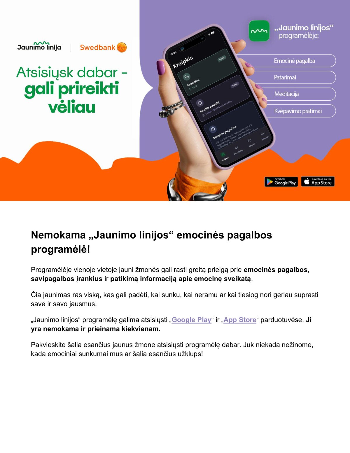 „Jaunimo linijos“ programėlę galima atsisiųsti „Google Play“ ir „App Store“ parduotuvėse. Ji yra NEMOKAMA ir prieinama kiekvienam!