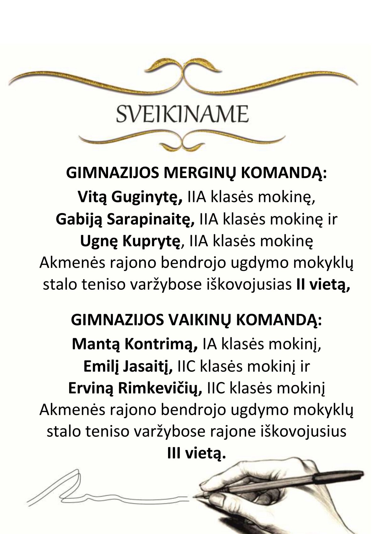 Akmenės rajono bendrojo ugdymo mokyklų stalo teniso varžybose rajone iškovojusius III vietą.