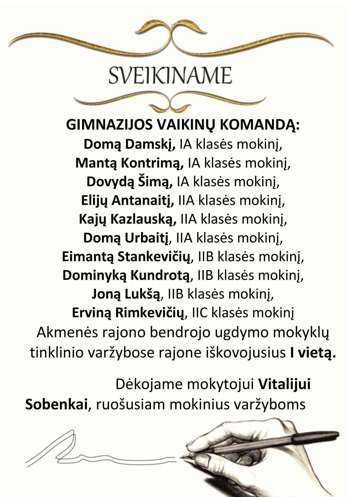 Akmenės rajono bendrojo ugdymo mokyklų tinklinio varžybose rajone iškovojusius I vietą.