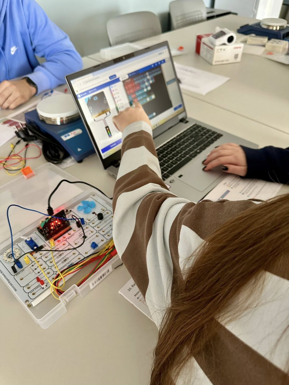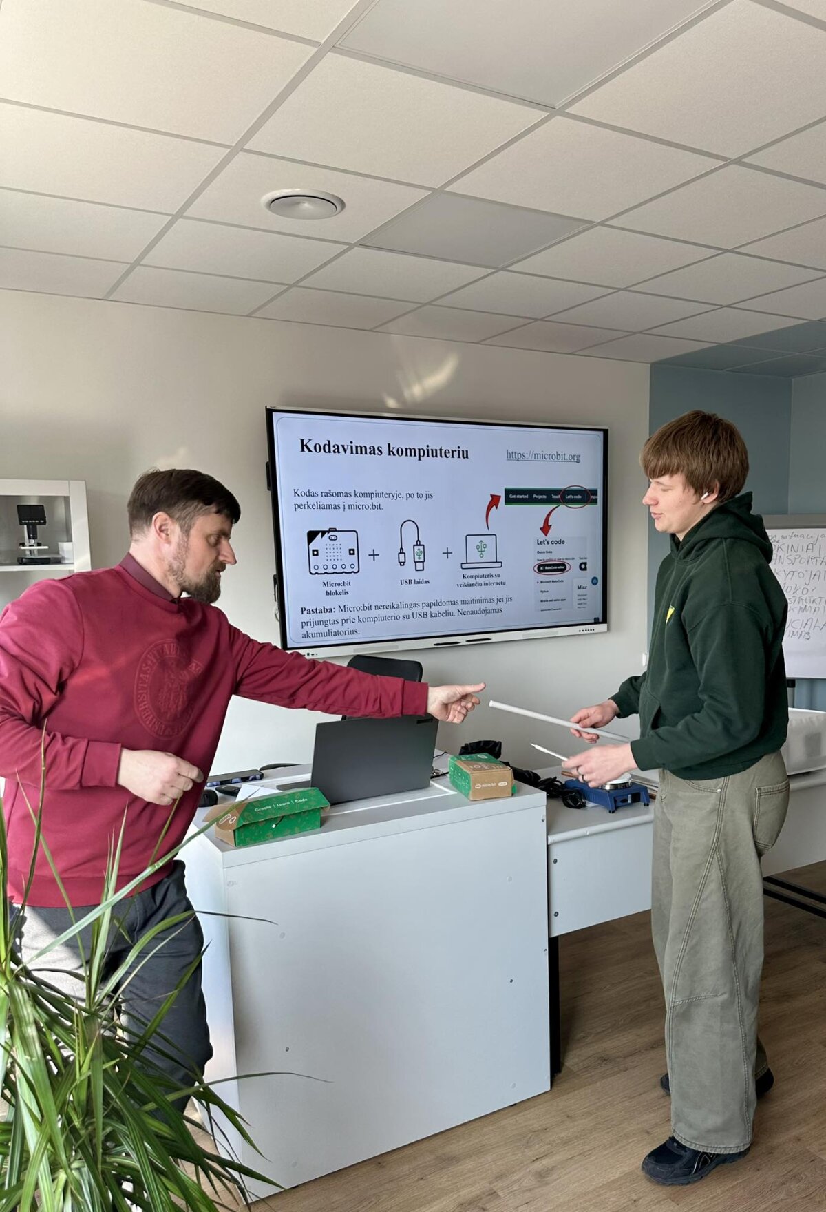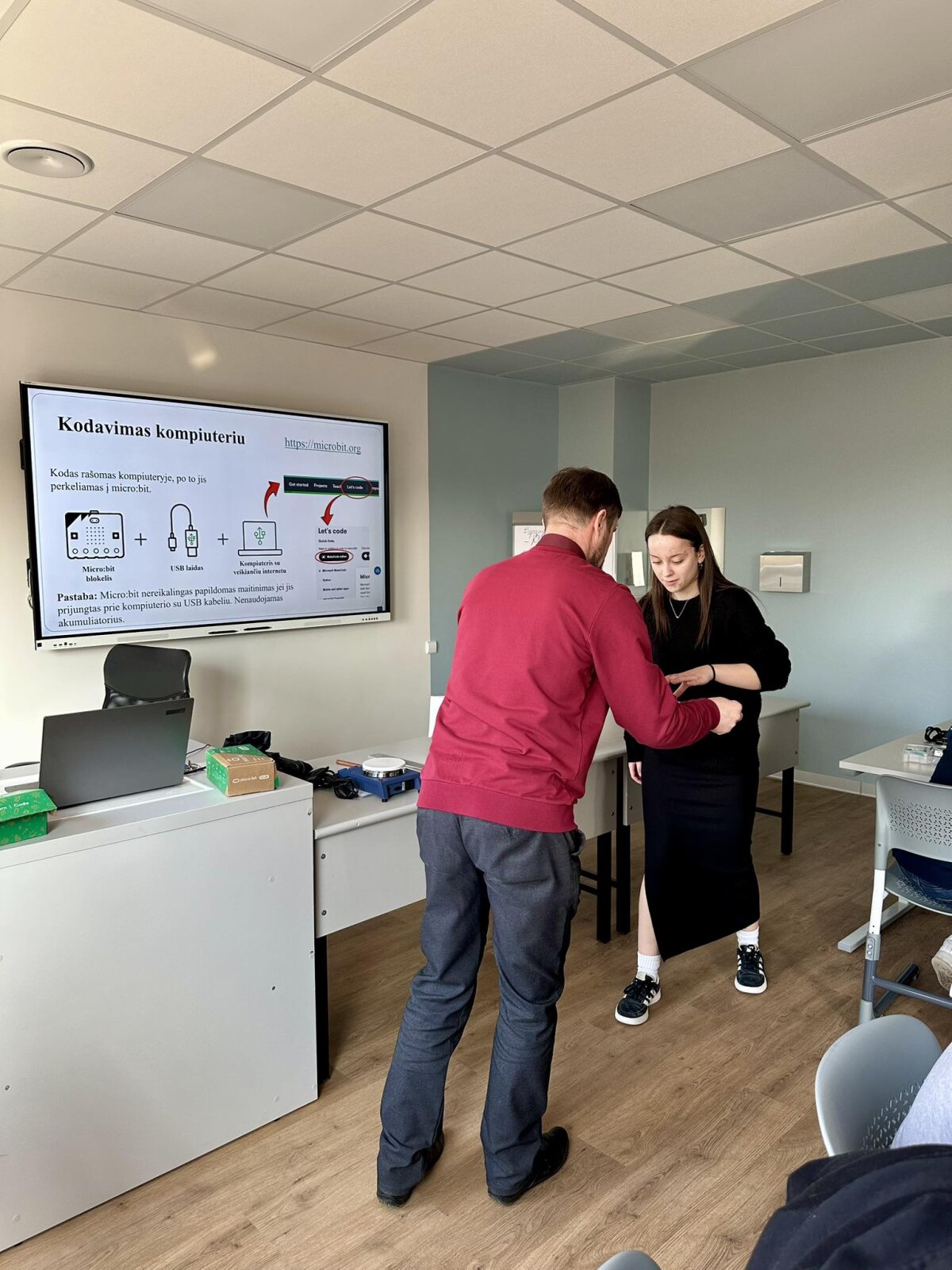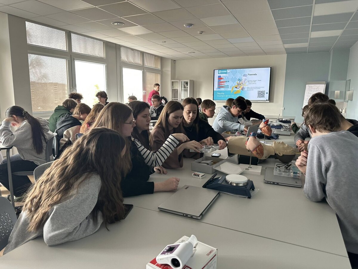Didelio mokinių susidomėjimo sulaukė praktinė veikla. Dirbdami su micro:bit mikrovaldikliais ir robotikos rinkiniais „Nezha Inventor’s Kit“, mokiniai susipažino su paprasto kodo kūrimo principais ir pamatė, kaip programavimas gali būti pritaikomas valdant įvairius mechanizmus. Naudodamiesi programavimo aplinka Microsoft MakeCode jie kūrė pirmuosius programavimo sprendimus ir praktiškai išbandė technologijų veikimą.